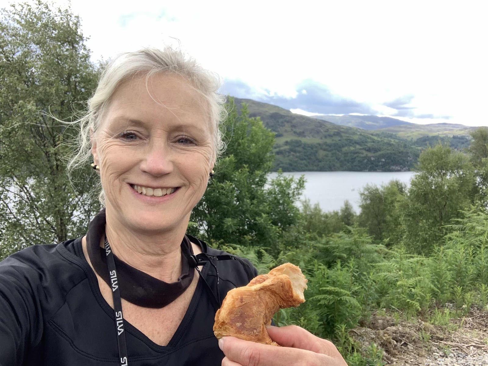 View of Loch Ness looking north. Pack with a croissant on it waiting to be chewed.