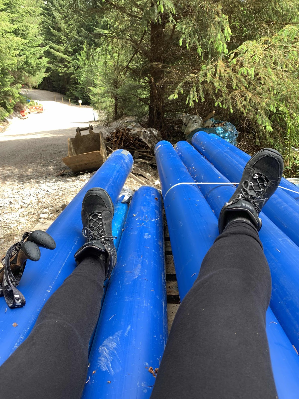 As it was Sunday the forestry and water supply crews were not out in the woods working. Used a pile of large blue plastic piping stacked on the side for a rest. First sat on the side, then stuck the right foot up to elevate, then the left leg joined. Soon this entire person was stretched out on the pipes relaxing. It felt wonderful and almost became drowsy.