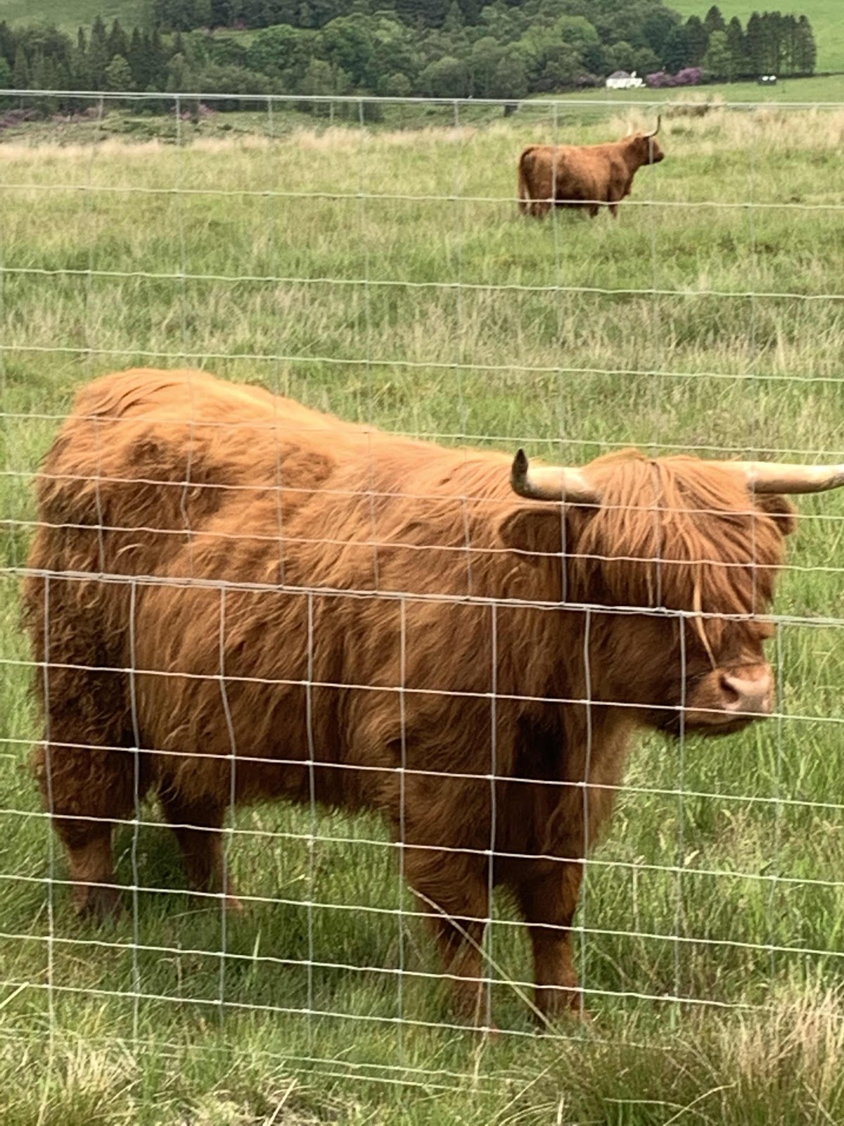 The route led uphill through Mugdock wood past a few slightly swampy smallish lochs. A few short sections of road walking which is a bit dangerous with the narrow road and overly confident drivers coming around curves. Past fields with pretty sheep (baa baa), long haired cattle (hairy coo), and the beginning of rolling hills in the distance.